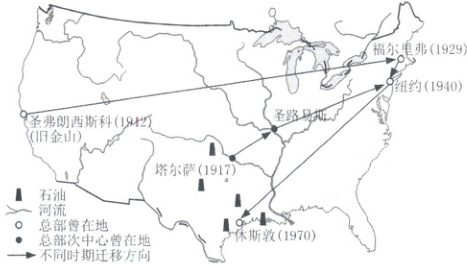 [汕头二中月考]为了在美国销售部分原油,英国某著名石油跨国企业于1912年进入美国市场,并在圣弗朗西斯科(旧金山)成立分公司。此分公司总部的布局在美国本土发生了多次变化,下图示意该总部布局变化状况。读图,完成1、2题。