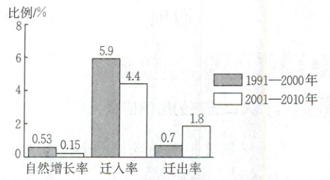 [大连检测]下图为我国某省 20 世纪 90 年代和 21 世纪前 10 年平均人口年变化率,其中迁移人口以青壮年为主。读图,完成 8、9 题。
