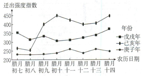 [大庆实验中学期末]迁出强度指数,是利用互联网服务请求的数量,通过算法测算各城市人口流往其他城市的情况。迁出强度指数并不是实际迁出人数,但也是判断人们就地过年情况的主要依据。下图示意我国农历戊戌年(2018.02.16—2019.02.04)、己亥年(2019.02.05—2020.01.24)和庚子年(2020.01.25—2021.02.11)腊月某城市相同时段人口迁出强度指数变化。据此完成 1~3 题。