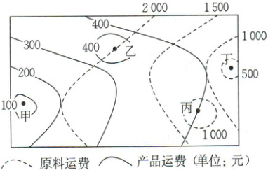 3.D 【解析】依题意,原料和产品运费之和最小处是最佳厂址,经计算可知丁处每万元产值的运费小于1000元,是四地中最少的,故D项正确。