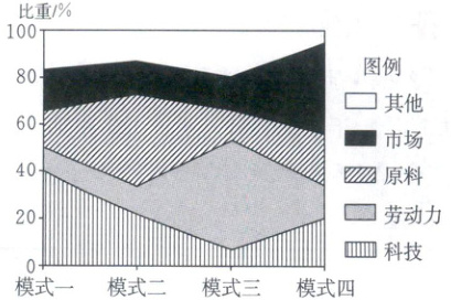 4.D 【解析】读图分析,模式三工业的区位选择上,劳动力所占比例最大,说明为劳动力导向型工业,该类工业需要大量的廉价劳动力,适宜布局在劳动力丰富廉价的地区,A错误;该类工业环境污染较轻,可以布局在劳动力丰富的市区,B错误;读图可知,该模式科技因素的所占比重较小,受科技影响较小,C错误;随着我国东部地区社会经济快速发展,劳动力成本上升,该产业在我国由沿海向劳动力成本较低的内陆转移,D正确。