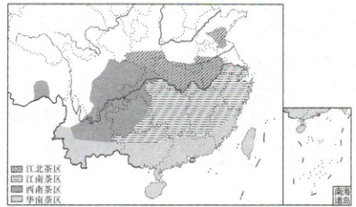 [大庆一中月考]茶,常绿灌木,世界三大饮料之一,鲜叶需人工采摘。下图示意我国四大茶叶产区分布。读图,完成1、2题。