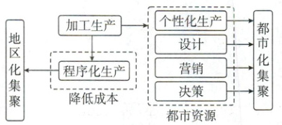 7.D【解析】据图判断,地区化集聚侧重于区位选择,生产成本低,利润较高,A、B两项错误;都市化集聚侧重于个性化生产,各环节、部门密切合作,注重产业链培育,利润较高,C项错误,D项正确。