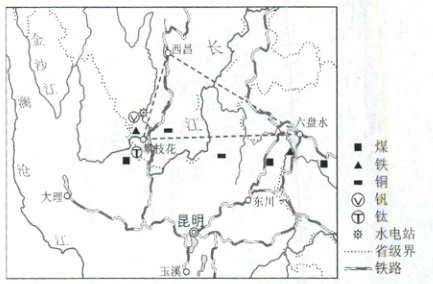 (2)攀枝花以钒钛磁铁矿为主,多伴生矿、贫矿;中小企业多,生产规模小;生产工艺技术水平较低,企业设备比较落后;缺乏相关技术人才。(任答3点,每点1分,共3分)