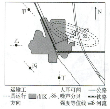 [九江三中月考]下图为我国华北平原某城市的人耳可闻噪声分贝强度等值线分布图(单位:PNdB),图中 M 点代表交通运输网中的点。读图,完成 3、4 题。