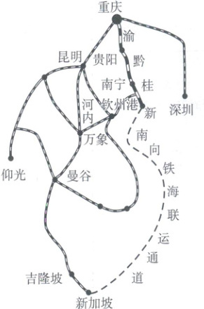 [天津一中月考]渝黔桂新南向铁海联运通道(简称“南向铁海联运通道”,如图所示)以重庆为起点,向南行至广西钦州港,再衔接海运至新加坡等东盟各港口,进而连通国际海运网。南向铁海联运通道每年开通 300 班以上,实现常态化运行,这为我国西部地区的货物提供更为便捷的出海通道。据此完成 7、8 题。
