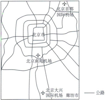 [恩施高中月考]北京大兴国际机场是建设在北京市大兴区与河北省廊坊市之间的超大型国际航空综合交通运输枢纽,它的建成投运大大缓解了北京首都国际机场面临的航空运输的紧张局面。下图示意北京大兴国际机场的位置。据此完成 1、2 题。