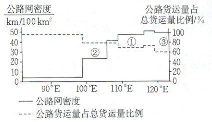 [桂林中学月考]下图为我国 30°N 纬线经过的六省(区)的公路网密度和公路货运量占该省(区)总货运量比例图。读图,完成 8、9 题。