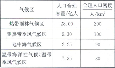 7. 按表中数据推算,下列气候类型所在地区远没有达到人口合理容量和合理人口密度的是(