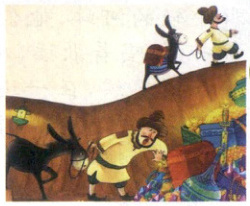 ②那帮人马跑到那棵大树旁,勒马停步,在一块大石头前站定。他们共有四十人,一个个年轻力壮,行动敏捷。他们在树下拴好马,取下沉甸甸的鞍袋,里面显然装着金银珠宝。看来,这是一伙拦路抢劫的强盗,刚刚抢劫了满载货物的商队。