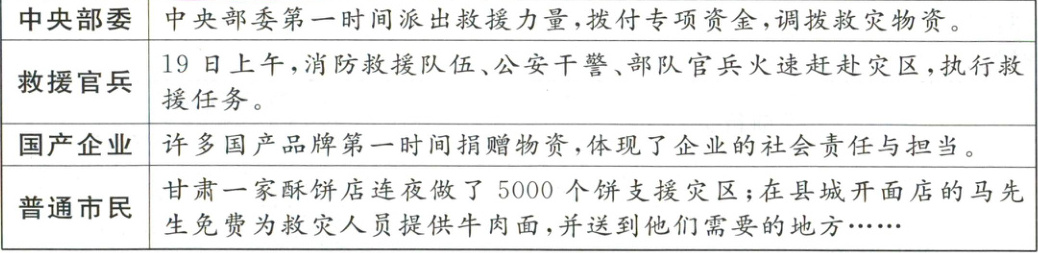解析:解答本题时,先理解题目意思,再结合材料以及实际生活进行理解。材料中提到,震后第一天,从个人到国家都希望尽自己所能帮助当地受灾群众,某快递公司开通“救灾捐赠物资免费寄递通道”,生活中,身边的同学、朋友们也纷纷为灾区人民捐赠物资,这正体现了“一方有难,八方支援”。