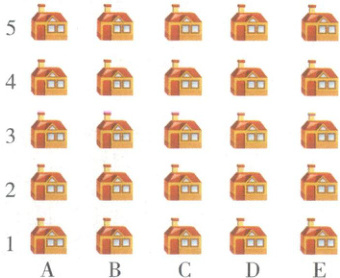 施工材料发放点在$(D,x)$,$x$可以取1、2、3、4、5,所以发放点可能是D列第1行、第2行、第3行、第4行、第5行的房子,将D1、D2、D3、D4、D5的房子圈一圈。