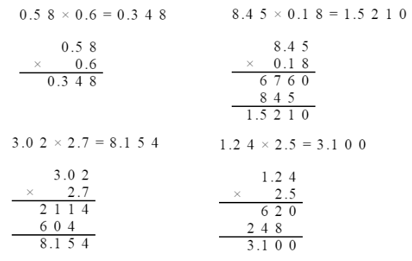 【归纳总结】1. 两个因数的小数位数之和正好等于积的小数位数。2. 如果乘得的积的末尾有“0”,要先数出小数位数,点上小数点,再把末尾的“0”划掉;如果位数不够,要在前面用“$(\quad)$”补足,再点上小数点。
