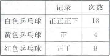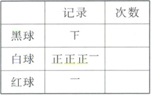 三、小朋友们在黑色不透明的袋子里摸颜色不同的乒乓球,每次摸出一个乒乓球,再把摸出的乒乓球放回袋子里并摇匀,一共摸了30次,摸出的乒乓球次数如下表。