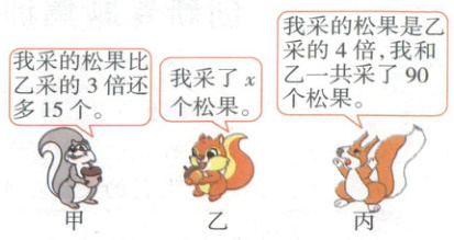 4.解:由题可知,乙松鼠采了x个松果,则丙松鼠采了4x个松果,甲松鼠采了(3x+15)个松果。