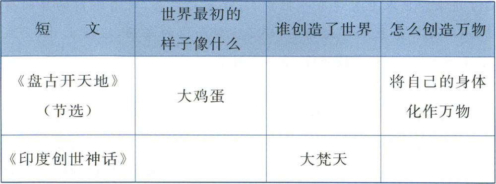 (2)B 考点:本题考查联结运用的能力。 解析:短文(一)中第1自然段描写盘古醒来后,用身边的斧头开天辟地的情景,故而选择选项C。短文(一)中最后一个自然段描写盘古倒下后身体发生的变化,因此选项B更为准确。 3.盘古 金色的圆蛋 施展神的威力,把自己的身体化成万民和人的情绪 考点:本题考查提取信息的能力。 解析:短文(一)中写到世界最初的样子是个大鸡蛋,是盘古将自己的身体化为了万物,短文(二)中写到世界最初的样子是金色的圆蛋,是大梵天施展神的威力,把自己的身体化成了万民和人的情绪。 4.A 考点:本题考查推断解释的能力。 解析:通过阅读两篇短文,我们可感受到盘古和大梵天勇敢无畏,敢于牺牲自己,造福大众的精神。选项A是正确的,选项B和选项C是错误的。 5.C 考点:本题考查推断解释的能力。 解析:抓住题干中的关键词“中国的其他神话故事”进行推荐即可。选项A为希腊的神话故事书,不属于中国。选项B《本草经》为中国的药物学著作。故选项C是正确的。
