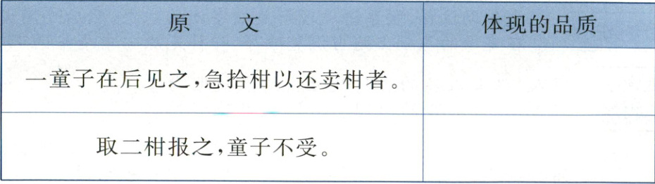 解析:“拾、还、不受”写出了文中孩子将柑橘捡起并还给卖柑橘的人,还不接受酬谢的过程,从中可以感受到这个孩子乐于助人和不求回报的品质。