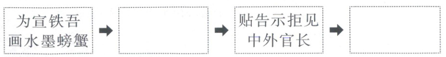 ①抗日战争时期,北平伪警司令、大特务头子宣铁吾过生日,硬要邀请国画大师齐白石赴宴作画。齐白石来到宴会上,环顾了一下满堂宾客,略微思索,便铺纸挥洒,转眼之间,一只水墨螃蟹跃然纸上。众人赞不绝口,宣铁吾喜形于色。不料,齐白石笔锋轻轻一转,在画上题了一行字——“横行到几时”,后书“铁吾将军”,然后仰头拂袖而去。宣铁吾面红耳赤,无地自容。