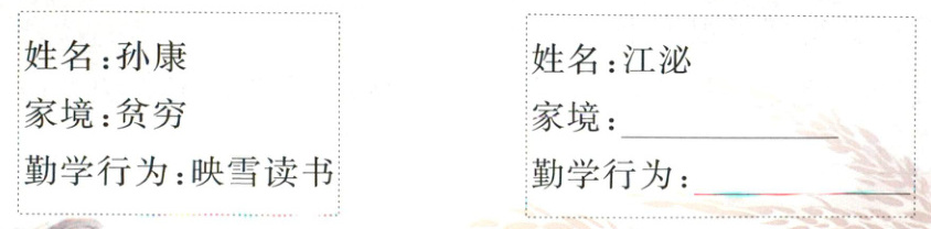 思路:阅读选文(二)可知,江泌家里贫穷,所以他晚上靠月光的照射来读书,跟着月光的移动而变化位置,据此组织答案即可。