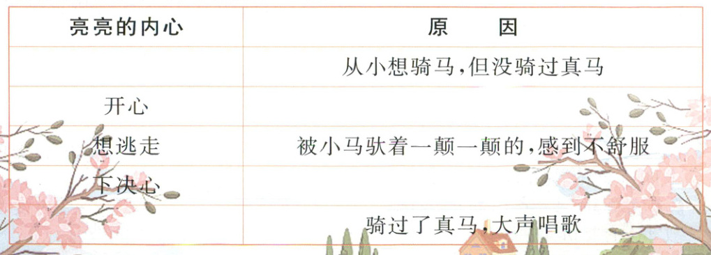 )——骑上了真马2. 在这件事情中,亮亮的内心有怎样的变化?为什么会有那样的变化?结合相关语句,填写表格。(4分)