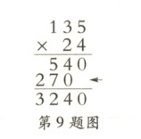 9. 学校买了 24 个足球,每个 135 元,一共付多少钱?东东用竖式计算结果,竖式中箭头所指的“270”表示的是(