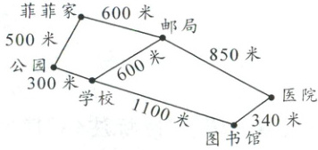 3.500+300+1100=1900(米) 600+850+340=1790(米) 600+600+1100=2300(米) 1790<1900<2300 答:走菲菲家→邮局→医院→图书馆这条路最近,要走1790米。
