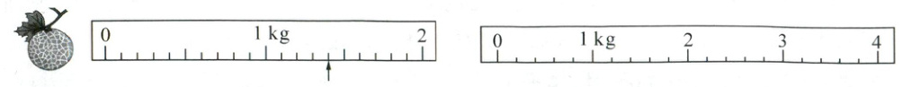 1. (2024·杭州临安)下面左边是使用秤称一个哈密瓜时秤显示的质量。右边还有一台不同的秤,请在右边秤上标出这个哈密瓜的质量。(2分)