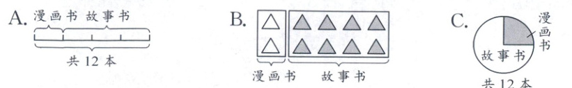 2. (2025·杭州钱塘)图书漂流捐赠活动中,阳光小队共捐了12本书,其中$\frac{1}{4}$是漫画书,$\frac{3}{4}$是故事书。下列表示错误的是(