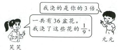 3. 36÷9 = 4(盆) 4×3 = 12(盆) 答:笑笑浇了4盆花,元元浇了12盆花。