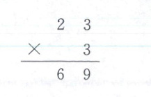 4. 1 个笔记本 3 元,23 个笔记本多少元? 右图竖式中,“6”表示___个笔记本___元。横线上分别填(