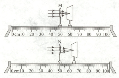(选填“M”或“N”)对光的会聚作用更强。(2)该同学继续利用上述器材及一个发光体、刻度尺探究凸透镜成实像时,像的高度与焦距是否有关。实验中需要选用凸透镜