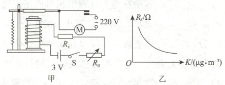 15. (4分)如图甲是室内自动换气系统的电路图。控制电路的电源电压为3V,R₀为电阻箱,Rₖ的阻值与烟雾浓度K的关系如图乙所示。当电磁铁线圈中的电流I≥0.03A时,衔铁被吸下,电风扇转动,开始排气。