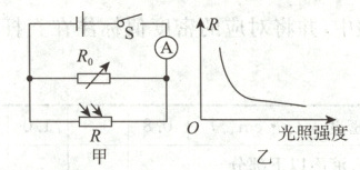 14. 光照强度会影响花卉生长。图甲为光照强度过大时触发报警的电路,电源电压不变,$R_{0}$为阻值可调的电阻箱,$R$为光敏电阻,其阻值随光照强度变化关系如图乙。当电流表示数大于某一值$I_{0}$时触发报警,$I_{0}$时的光照强度为警戒光照强度。闭合开关S,下列说法正确的是(