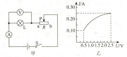 8. 科技小组的同学按图甲所示的电路研究自制小台灯的调光效果,灯泡L标有“2.5V”字样,电源电压恒为4.5V,电压表量程为“0~3V”,电流表量程为“0~0.6A”。闭合开关S,在确保电路安全的情况下,最大范围移动变阻器的滑片P,观察灯泡L的亮暗,绘出灯泡L的I-U图像如图乙所示。下列分析正确的是(
