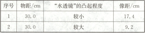 不变,继续向“水透镜”中注入适量的水,增加“水透镜”的凸起程度,调节光屏的位置,直至呈现烛焰清晰的像并记录像距。(5)把实验中收集的数据和观察的现象填入下表。
