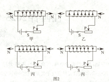 。(2)观察分析图2甲、丙两图,电源正负极的接法相同,通电螺线管的同一端磁极
