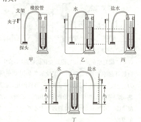 有关。(4)如图丁所示,为了便于测量探头所处的深度,小渝在探头支架上以橡皮膜平面所在位置作为起点标刻度,并将仪器改进为双探头,将左侧探头始终固定在水下h₁=8.8cm深处,调节右侧探头在盐水($\rho_{盐水}=1.1g/cm^{3}$)中的位置,使U形管左右液面再次相平,读出深度h₂=8cm,通过计算发现$\rho_{水}h_{1}$