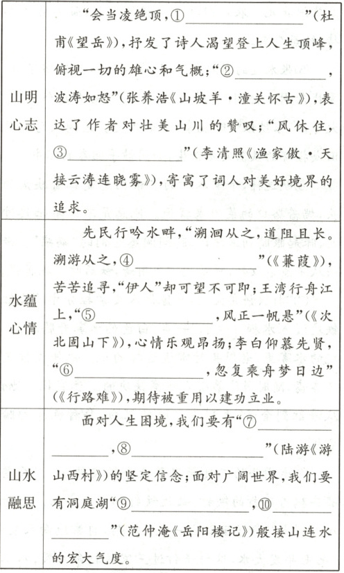 ⑨衔远山(“浩浩汤汤”亦可) ⑩吞长江(“横无际涯”亦可)
