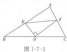 (3)如图 1-7-3,在△ABC 中,D 是 BC 的中点,DE⊥DF 于点 D,DE 交 AB 于点 E,DF 交 AC 于点 F,连接 EF,判断 BE+CF 与 EF 的大小关系,并证明。