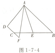 (4)如图 1-7-4,在四边形 ABCD 中,AB//CD,E 是 BC 的中点,AF 与 DC 的延长线交于点 F。若 AE 是∠BAF 的平分线,试探究线段 AB,AF,CF 之间的数量关系,并加以证明。