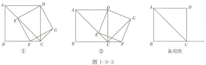 如图1-9-3①,在正方形ABCD中,点E在对角线AC上,点F在射线BC上,且四边形DEFG是正方形,连接CG。