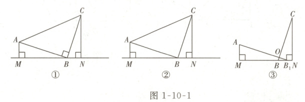 (1)如图 1 - 10 - 1①,直线$NM$过点$B$,$AM\perp MN$于点$M$,$CN\perp MN$于点$N$,且$\angle ABC = 90^{\circ}$. 求证:$MN = AM + CN$.