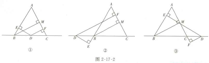 02 如图 2 - 17 - 2,已知在△ABC 中,AB = AC,BM⊥AC 于点 M,点 D 在直线 BC 上,DE⊥AB,垂足为 E,DF⊥AC,垂足为 F.