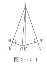 01 我们发现,“用不同的方式表示同一图形的面积”可以用来解决计算线段长的有关问题,这种方法称为等面积法.如图 2 - 17 - 1,在△ABC 中,AB = AC = 13,BC = 10,过点 A 作 AH⊥BC 于点 H,AH = 12,P 为底边 BC 上的任意一点,过点 P 作 PM⊥AB,PN⊥AC,垂足分别为 M,N,连接 AP,利用“等面积法”求 PM + PN 的值.
