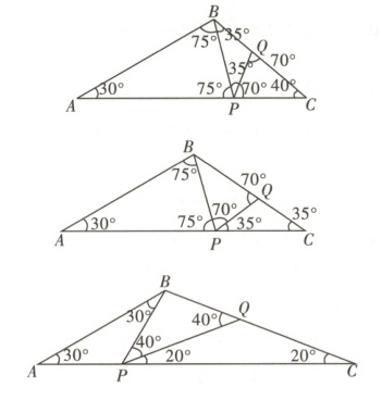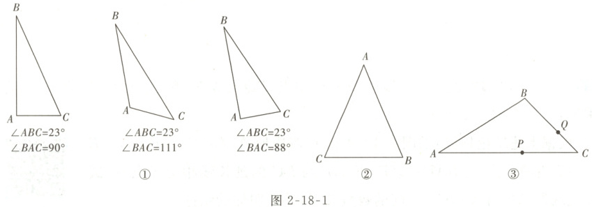 (4)思考:在如图 2 - 18 - 1③所示的三角形中,$\angle A = 30^{\circ}$,点$P$和点$Q$分别是边$AC$和$BC$上的两个动点,分别连接$BP$和$PQ$,把$\triangle ABC$分割成三个三角形$\triangle ABP$,$\triangle BPQ$,$\triangle PQC$,若分割成的这三个三角形都是等腰三角形,请直接写出$\angle C$的所有可能值.