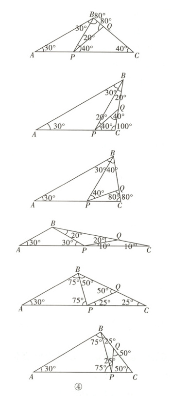 (4)如图④所示,共有9种情况,∠C的度数有8种情况,分别为40°,35°,20°,100°,80°,10°,25°,50°.