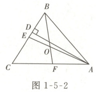 (2) 如图 1 - 5 - 2,在$△ABC$中,$AD$是$BC$边上的高,$AE$,$BF$分别是$∠CAB$,$∠ABC$的平分线且相交于点$O$,$∠CAB = 50^{\circ}$,$∠C = 60^{\circ}$,求$∠DAE$和$∠BOA$的度数。