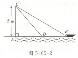 如图5-65-2,一游船在水面上,水面离河岸的高度为5m,工作人员站在岸边用绳子拉船靠岸,开始时绳子的长BC为13m,工作人员以0.5m/s的速度拉绳子,10s后船移动到D点的位置(B,D,A三点在同一直线上),请你计算船向岸边移动的距离BD.(假设绳子是直的,结果保留根号)