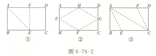 02 在一堂数学课上,张老师要求同学们在一张长 12 cm、宽 5 cm 的矩形纸片内折出一个菱形. 甲同学很快想了一个办法,他将较短的一条边与较长的一条边重合,展开后得到四边形 ABEF(如图 6 - 76 - 2①);乙同学按照取两组对边中点的方法折出四边形 EFGH(如图 6 - 76 - 2②);丙同学也不甘示弱,他沿矩形的对角线 AC 折出∠CAE = ∠DAC,∠ACF = ∠ACB,得到四边形 AECF(如图 6 - 76 - 2③). 请你帮助他们解决下列问题: