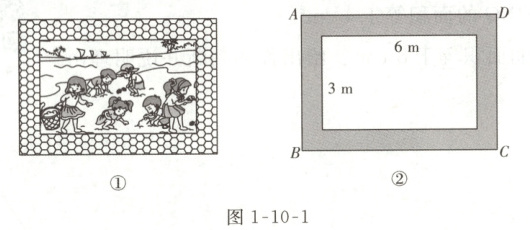 如图 1 - 10 - 1,如图①所示为一幅矩形地毯,四周镶有宽度相同的花边,如图②,经测量,地毯中央的矩形图案长 6 m、宽 3 m,整个地毯的面积是 40 m²,求花边的宽。